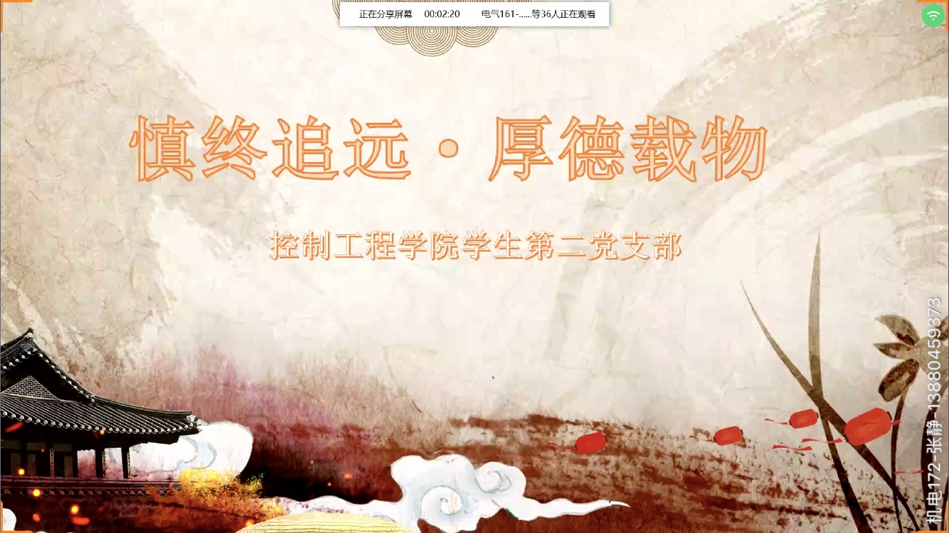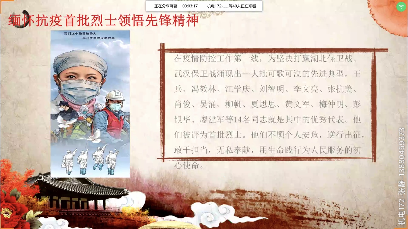 2020年4月3日晚7点,员工第二党支部开展了主题为“慎终追远 厚道载物”深切缅怀烈士和逝世同胞的主题活动。活动通过QQ群直播的方式开展,张静同志主持,党支部书记刘宇老师和全体党员参加。