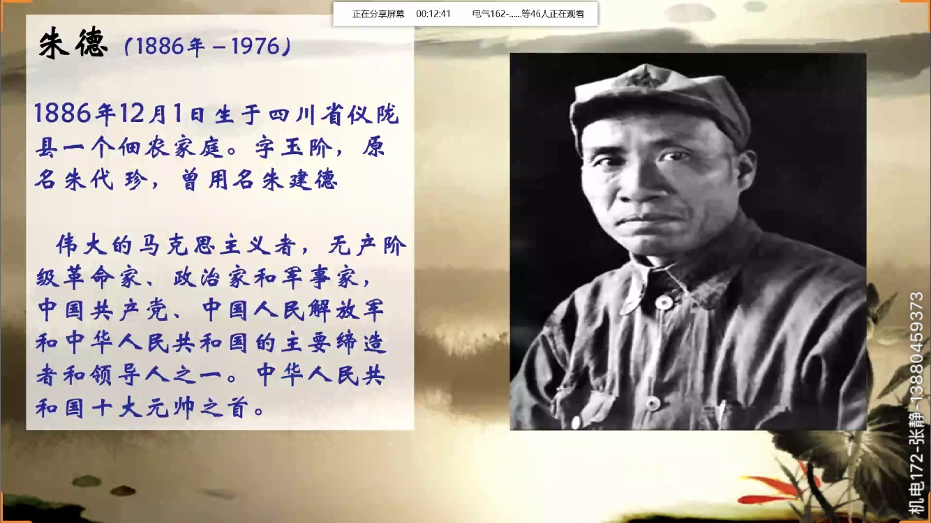 谭翔宇同志的家乡是四川南充,他向大家讲解了共和国十大元帅——朱德的故事。朱德为了拯救民族于危亡中,他考进云南陆军讲武堂,同年加入孙中山领导的革命团体中国同盟会。后来在云南参加辛亥革命武装起义,随后结识周恩来和其他共产党人,并加入中国共产党。在长期的革命和建设中,朱德根据马克思主义基本原理,结合中国的实际情况,创造性地提出了一系列关于唯物史、辩证法、认识论、唯物史观方面的理论和见解,大大地丰富了马克思主义哲学,为马克思主义哲学中国化做出了卓越的贡献。