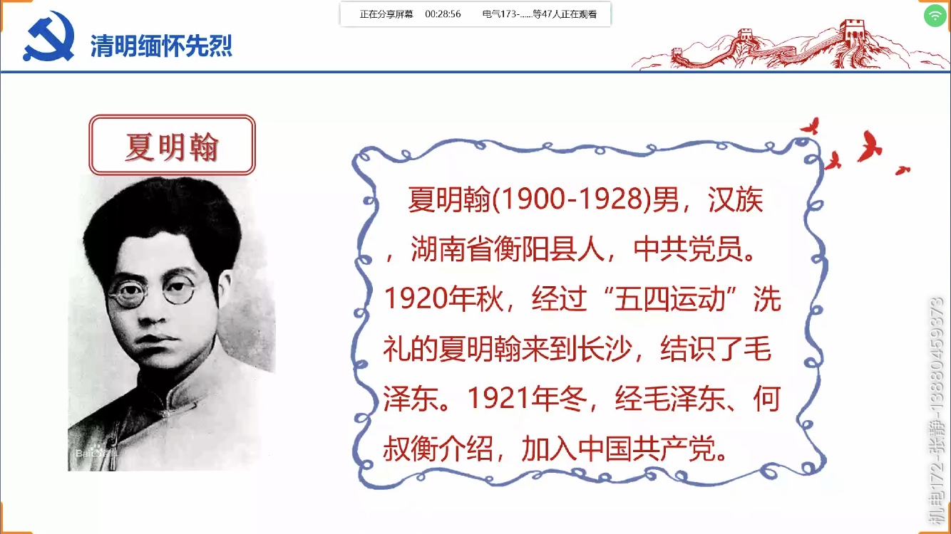 陈静诗同志来自湖南衡阳,他给我们讲解了先烈夏明翰的故事。他在1920年经过“五四运动”的洗礼后,结识了毛泽东,并经毛泽东、何叔衡介绍,加入中国共产党。1927年大革命失败后参与发动秋收起义,1928年由于叛徒出卖,被敌人逮捕。行刑前大义凛然,毅然写下就义诗:砍头不要紧,只要主义真。杀了夏明翰,还有后来人!年仅28岁。无数革命先烈们,为了人民的幸福、民族的解放和国家的富强,英勇战斗,直到流尽最后一滴血,永远长眠于我们脚下的这片热土。他们是中国的脊梁,是民族的骄傲!陈静诗同志也向全体党员提出倡议:不忘初心,砥砺前行。在和平年代,我们要争做一名优秀老员工,毕业后才能为社会、为国家贡献出自己的一份力量。