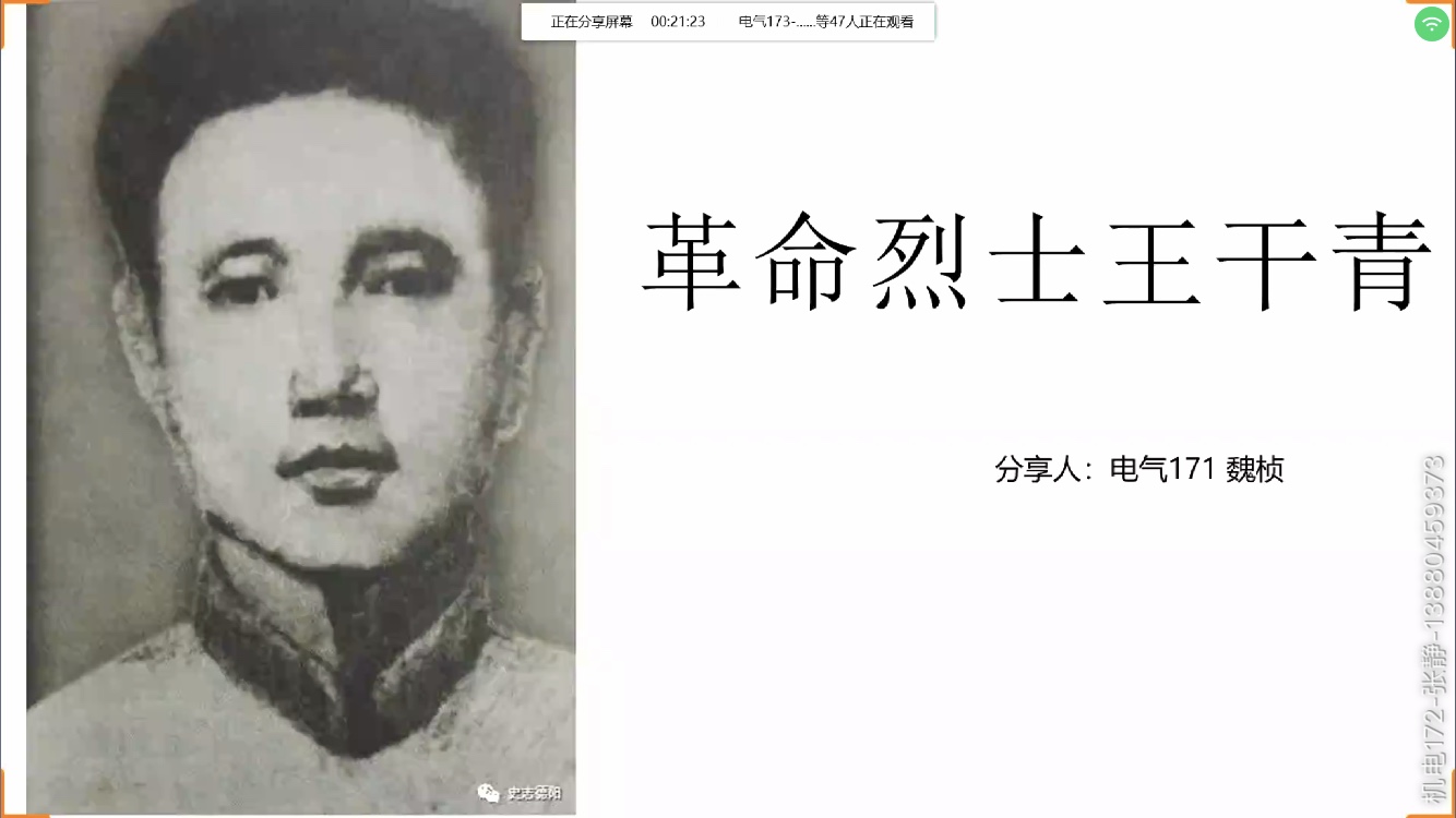 魏桢同志为我们分享了四川德阳的一名革命烈士——王干青的事迹。1928年他组织了“七四”农民暴动,目的是建立川西北苏维埃革命根据地。虽然运动的结局是以失败告终,但在川西北的土地上洒下了革命的星火,将共产主义带到了川西平原。他曾经说过:作为一名共产党员要勇于斗争,敢于发声,有是非观,辩证看待问题。1946年内战爆发后,王干青积极参加反蒋活动,大力支持川大、华大等校的进步员工运动。1949年被国民党特务逮捕,被害于成都十二桥畔。