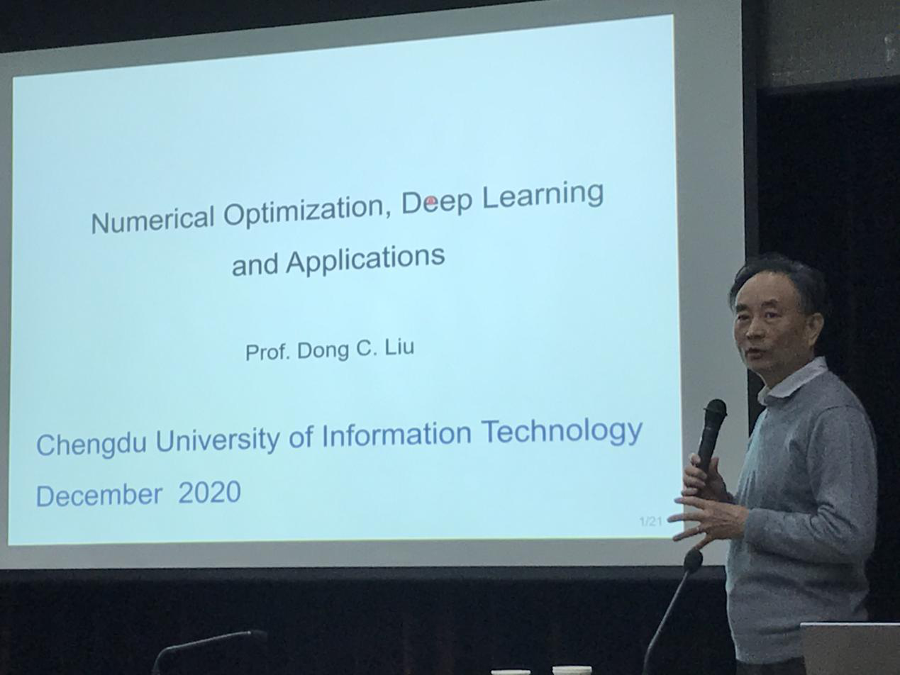 Dong C. Liu教授本次讲座主题为:“Numerical Optimization,Deep Learning and Applications”。Liu教授围绕数值优化、机器学习、深度学习及人工智能技术在图像识别的应用和展望等方面进行了深入浅出的介绍。与Dong C. Liu同实验室的PAUL SI-YAO LIU博士做了主题为:“Some applications of deep learning for handheld ultrasound”的报告,展示了新开发的产品,重点对产品系统中使用的深度学习、网络架构与设计进行了分析。