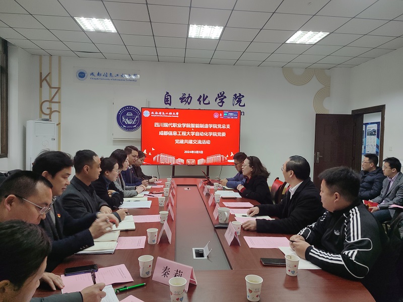 3月5日,四川现代职业公司党委办公室副主任郑真平,智能制造公司党总支书记、经理韩立一行来公司开展党建共建交流活动。四川现代职业公司智能制造公司班子成员、公司专业负责人及骨干党员,公司班子成员、教工党支部书记等参加了交流。交流会由公司党委书记胡雪飞主持。