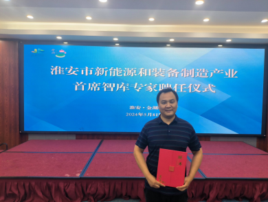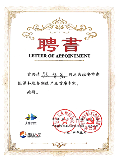 5月8日,中共淮安市委人才工作领导小组办公室、淮安市工业和信息化局举行淮安市新能源和装备产业首席专家张智亮教授聘任仪式。淮安市委组织部副部长、淮安市人才工作领导小组办公室主任姜洪洋向张智亮教授颁发聘书。