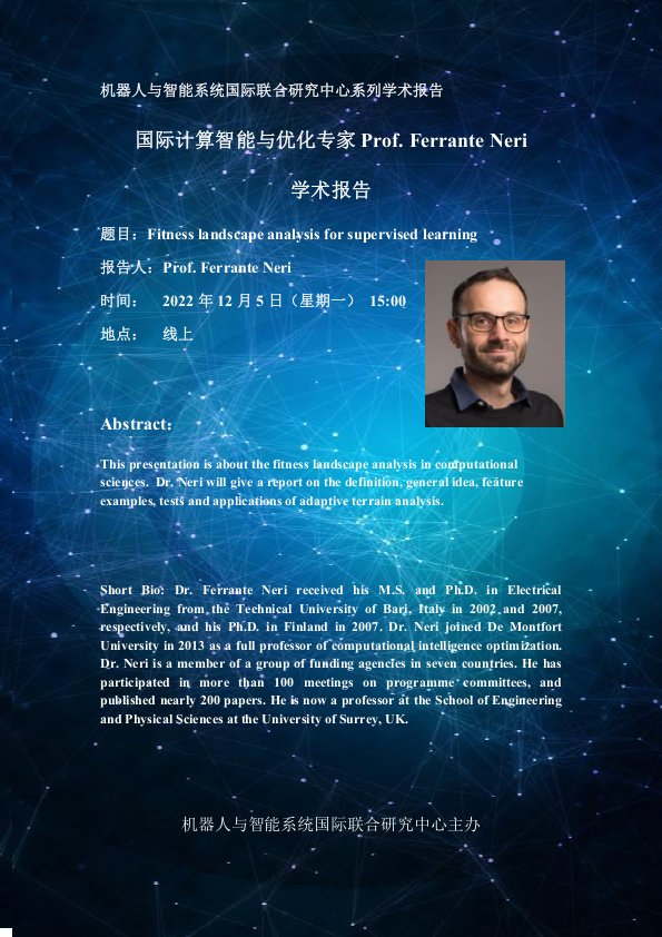 机器人与智能系统国际联合研究中心系列学术报告国际计算智能与优化专家Prof. Ferrante Neri学术报告