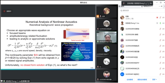 本次讲座主题为:“Numerical Analysis of Nonlinear Acoustics and its Application to Ultrasound Tissue Characterization”(“非线性声学的数值分析及其在超声组织表征中的应用”),刘教授展示了超声在非线性介质中传播的基波和二次谐波信号的封闭形式的方法,从中估计用于组织表征的非线性参数B / A,进而使用计算机仿真和体外实验进行系统校准和验证的方法,以验证其可靠性。