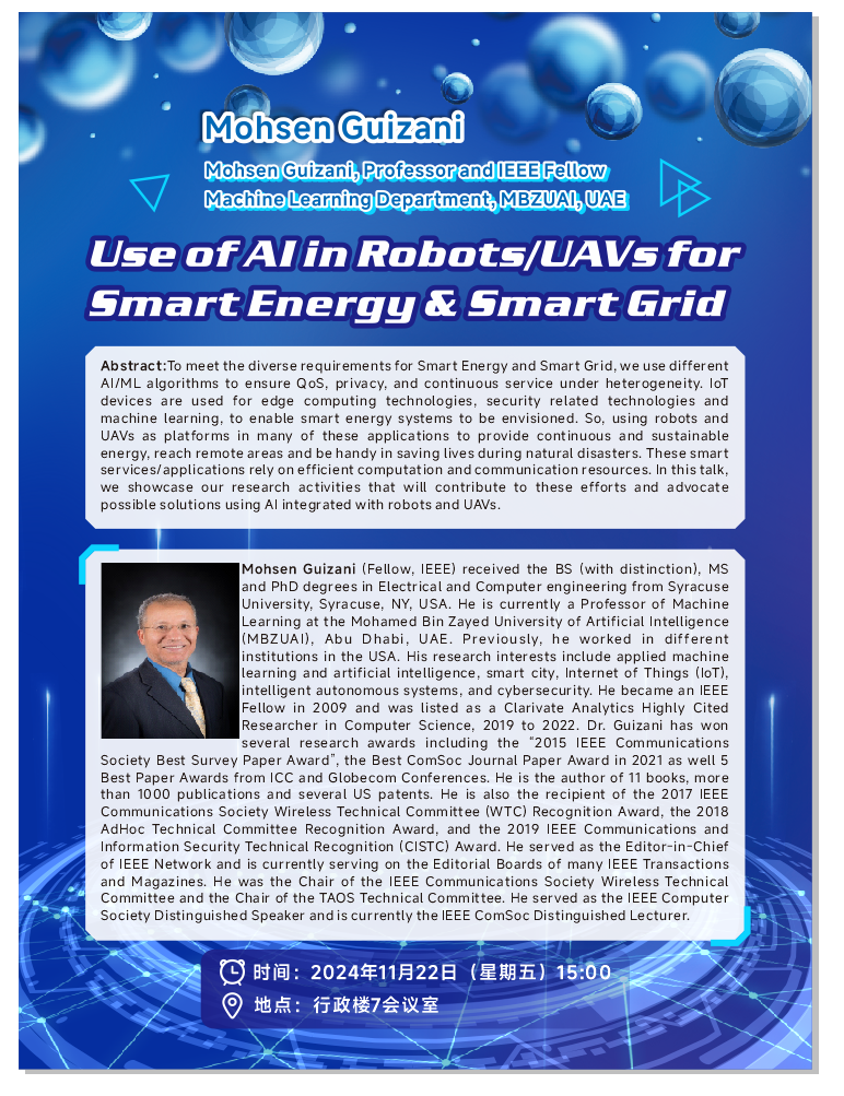 【学术预告】Use of AI in Robots/UAVs for Smart Energy & Smart Grid