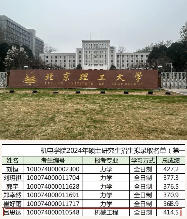 在过去的一年中,吕思达同学一直在准备硕士研究生考试。这一年他在自我肯定与自我否定的交织中度过,他深知考取学硕的路充满艰辛,但依然熬过酷暑、挺过寒冬,最终提交了那份承载梦想的答卷。今天,他已经以初试413分,初复试总分414.5分,专业第一的成绩拟录取于北京理工大学智能机器人研究所。